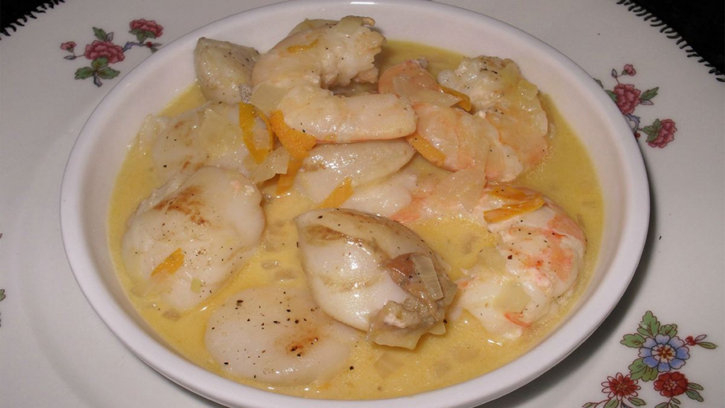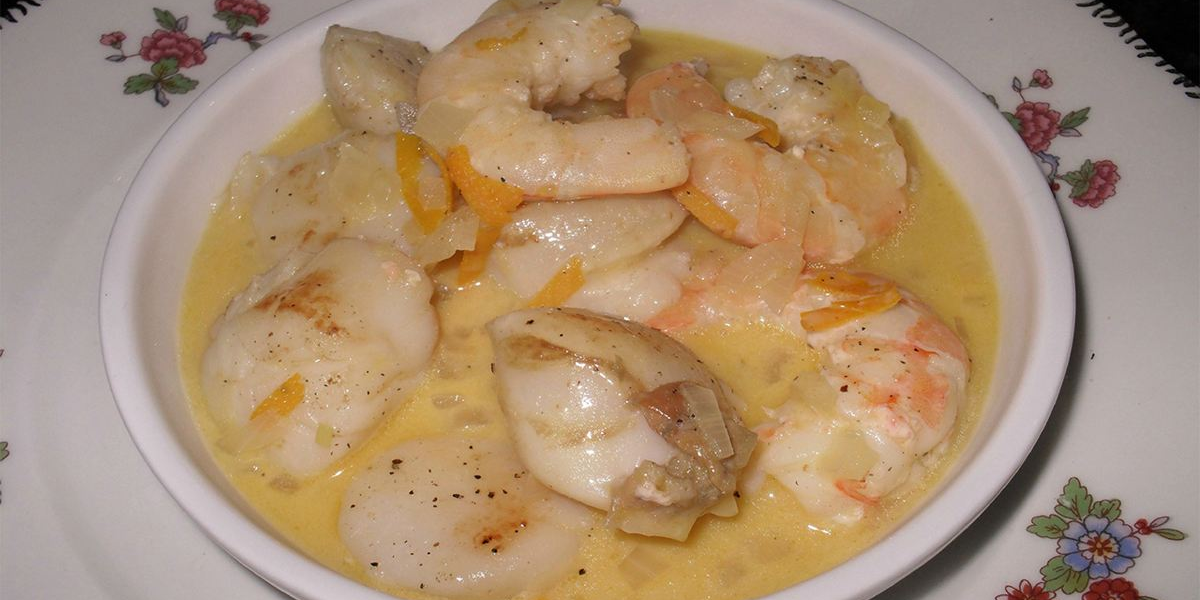 Sciogliere metà del burro in una padella. Far appassire gli scalogni puliti e tritati, quindi irrorarli con il succo degli agrumi. Rosolare i gamberi per 2 minuti per lato con il restante burro. Condire, quindi aggiungere le capesante. Cuocerli per 1 minuto per lato. Condire di nuovo. Flambé con la vodka. Aggiungere poi lo scalogno all’arancia. Infine versare la panna e amalgamare bene il tutto. Proseguite la cottura ancora qualche istante e servite subito la cremosa di capesante e gamberi all’arancia, spargendo qua e là la scorza di agrumi.