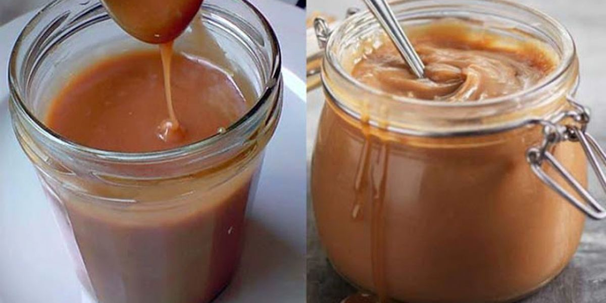 Fermare la cottura e trasferire il caramello al burro salato in un vasetto di marmellata.