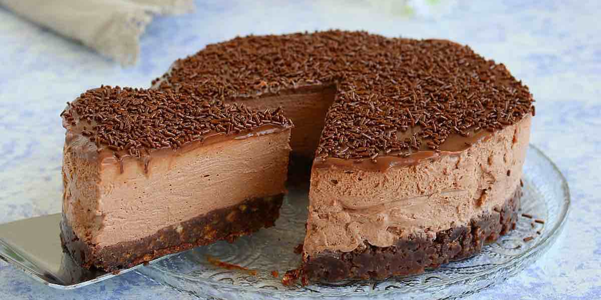 Versare la crema sulla base di biscotti, livellare e riporre la torta in frigorifero per 4 ore. La cheesecake al cioccolato senza cottura è pronta da gustare. Decorala con gocce di cioccolato per renderla ancora più golosa.