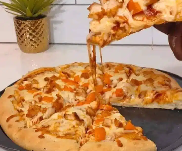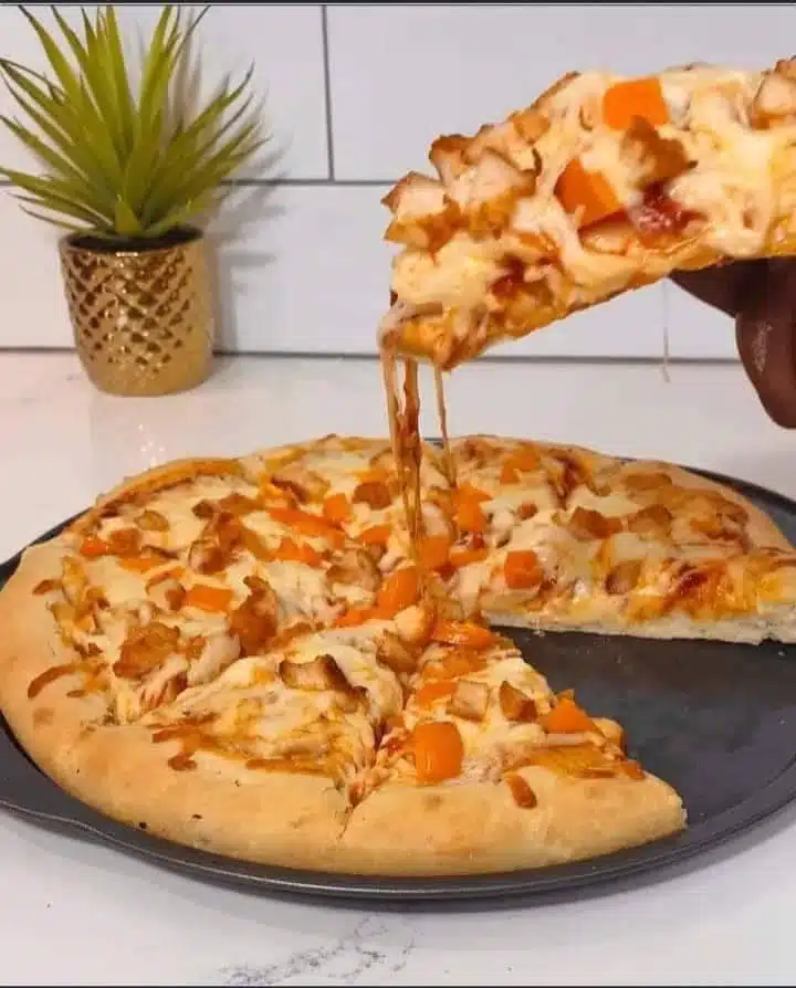 * Distribuire un po’ di salsa per pizza sulla superficie dell’impasto, aggiungere i peperoni (rossi e gialli), il pollo e il formaggio. Ripeti questo processo due volte. Spennellate l’impasto con un po’ di olio vegetale.