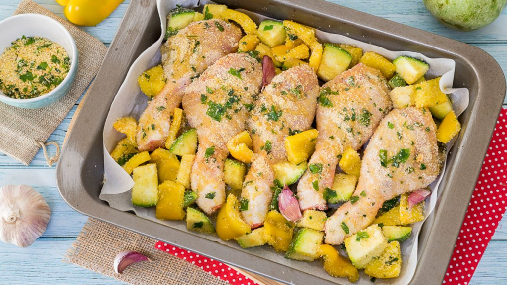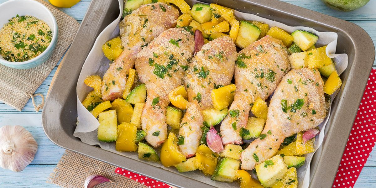 Come fare le cosce di pollo gratinate con peperoni e zucchine?