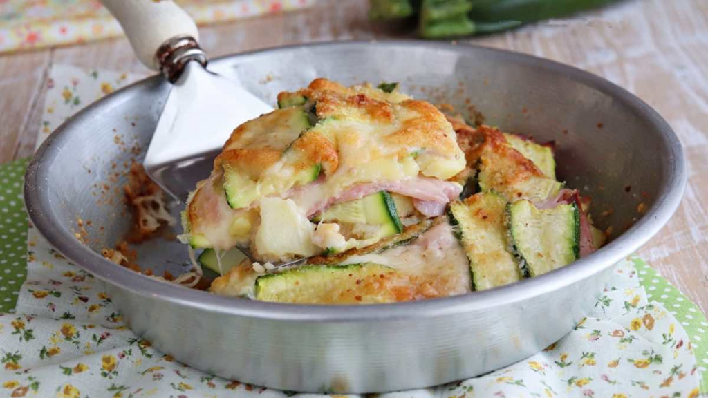 Lavate le zucchine e tagliatele a fettine sottili. Imburrare il fondo di una padella da 20 cm di diametro e cospargerlo di pangrattato. Creare uno strato di patate e poi di zucchine. Aggiungete sale, pepe, prosciutto cotto, mozzarella a fette e formaggio grattugiato. Ripetete ancora questa sequenza di ingredienti poi terminate con la mozzarella e il pangrattato.