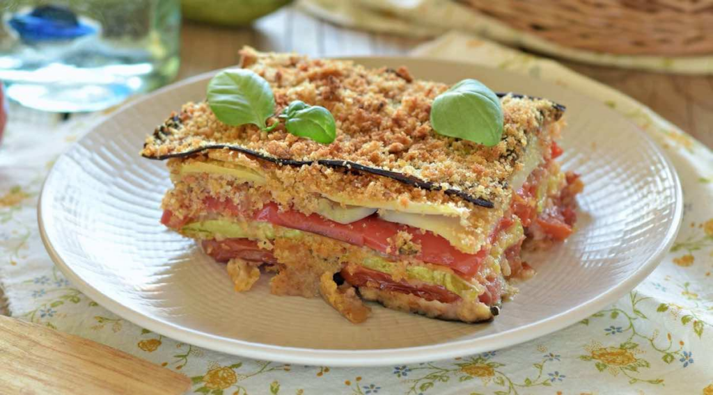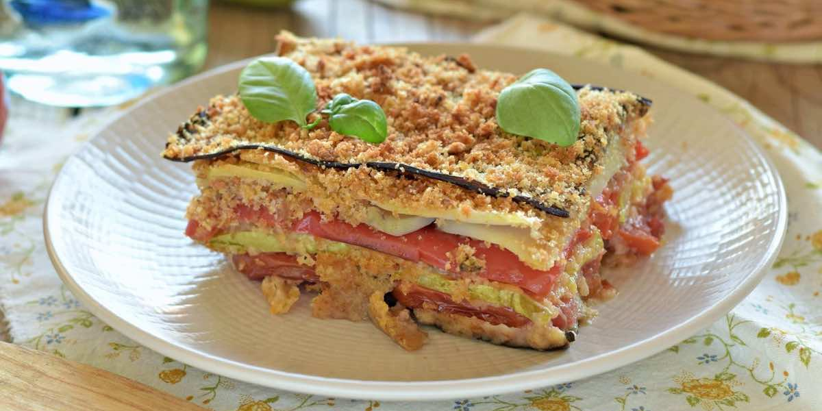 Foderare una tortiera con carta da forno umida e pressata. Alternare le verdure, realizzando uno strato per ciascuna. Dopo ogni strato spolverate con abbondante pangrattato, e mettete al centro la mozzarella (dopo 2 strati). Disporre le patate tra le altre verdure. Alla fine pressate con le mani per compattare bene il tutto.