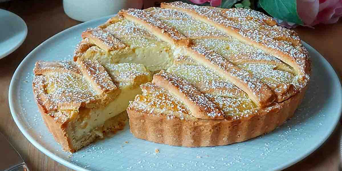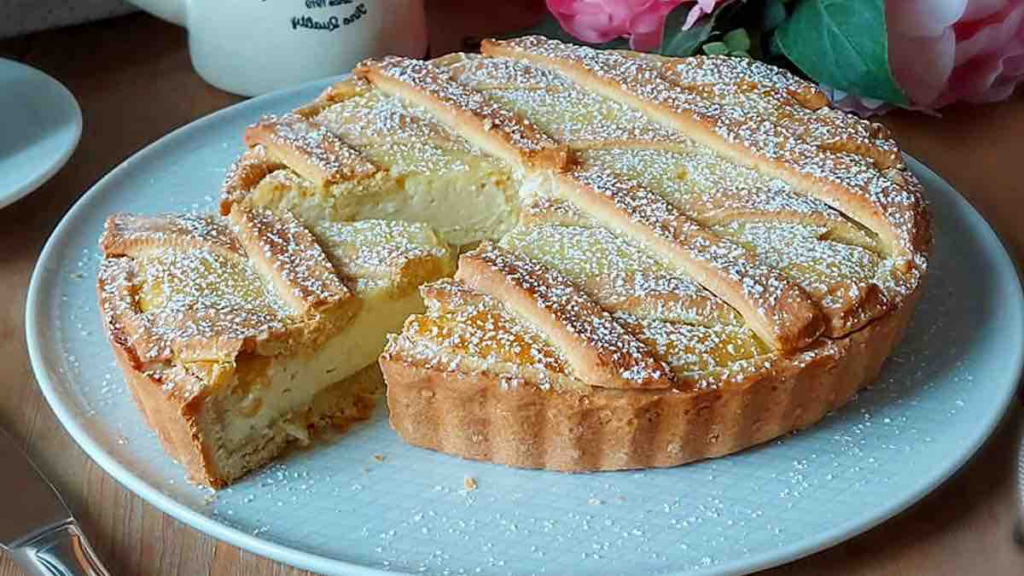 Una volta riposato, stendere 3/4 della pasta frolla. Foderare una tortiera da 24 cm imburrata e infarinata. Aggiungere il ripieno di crema. Con il resto dell’impasto decorate la crostata con le classiche strisce da crostata, avendo cura di sigillare bene i bordi.