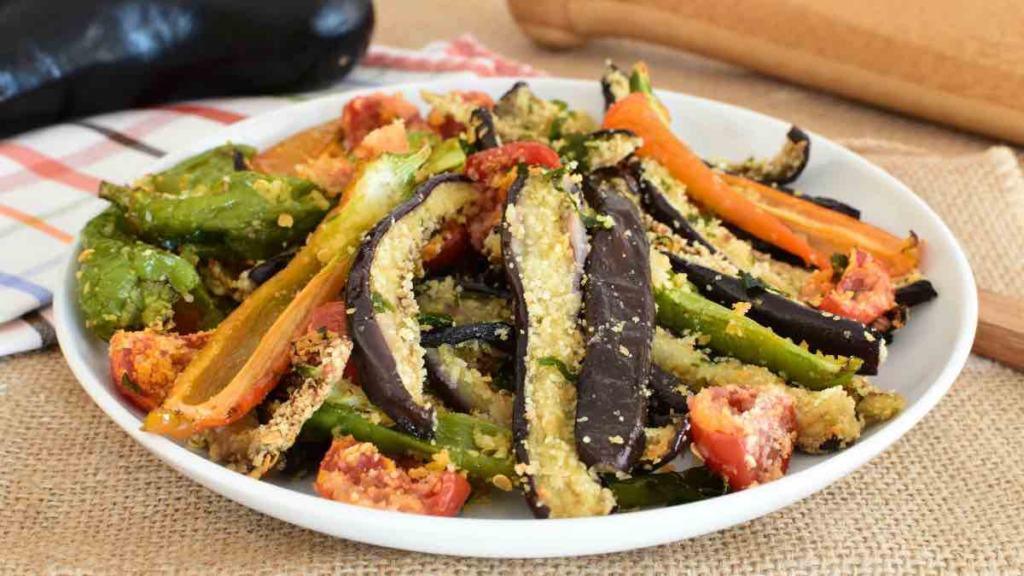 500 g di melanzane 300 g di peperoni Friggitelli 5 cucchiai di pangrattato 2 cucchiai di parmigiano 200 g di pomodorini ciliegino Olio per friggere Olio extravergine di oliva qb Origano qb Sale qb Basilico qb
