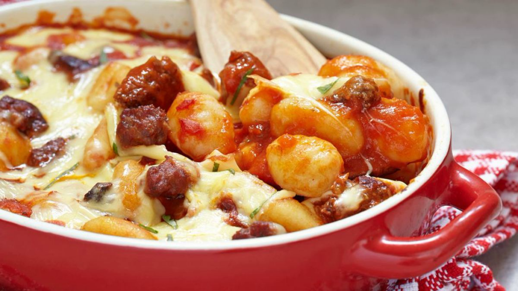 Trasferisci questo composto in una teglia. Cospargere con groviera grattugiato e infornare per dieci minuti. Gli gnocchi ai funghi e sugo di pomodoro sono pronti per essere serviti.