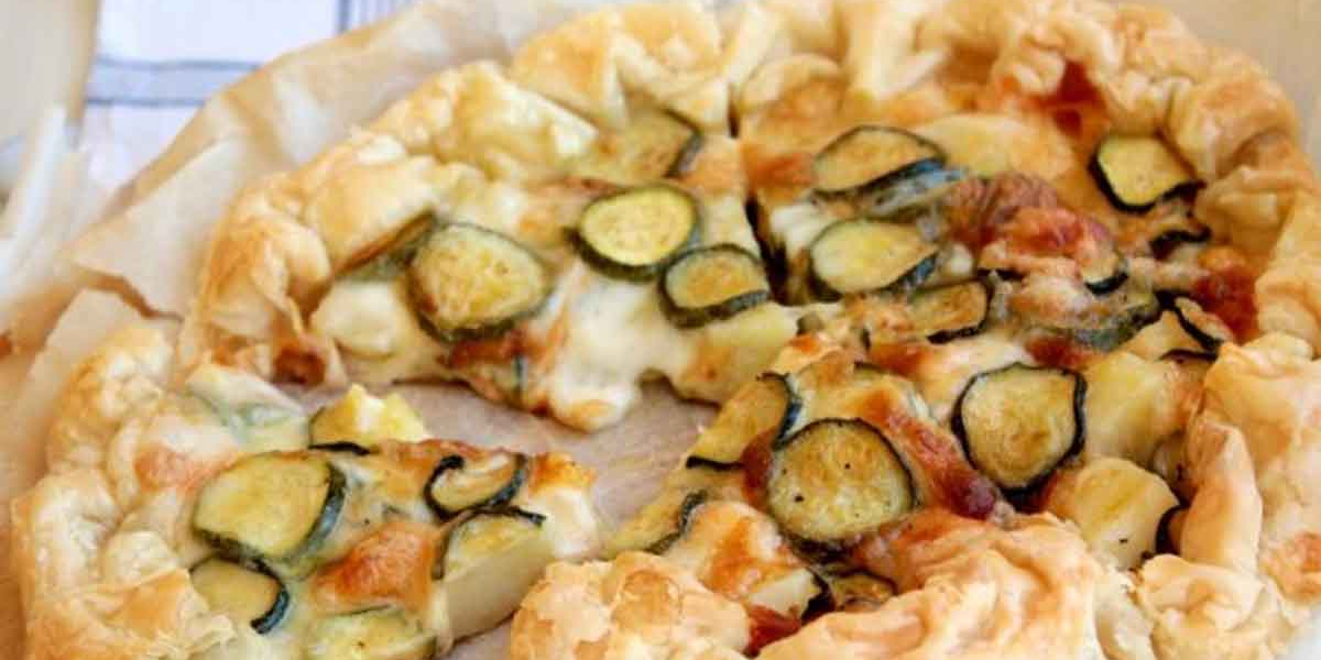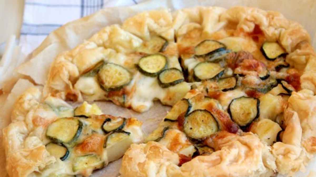 Bucherellare il disco di pasta sfoglia con i rebbi di una forchetta e farcirlo con le patate a dadini, le zucchine saltate e la scamorza a dadini.