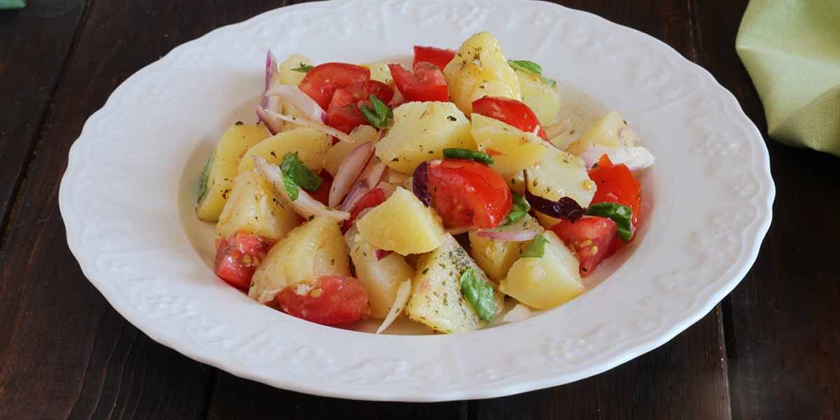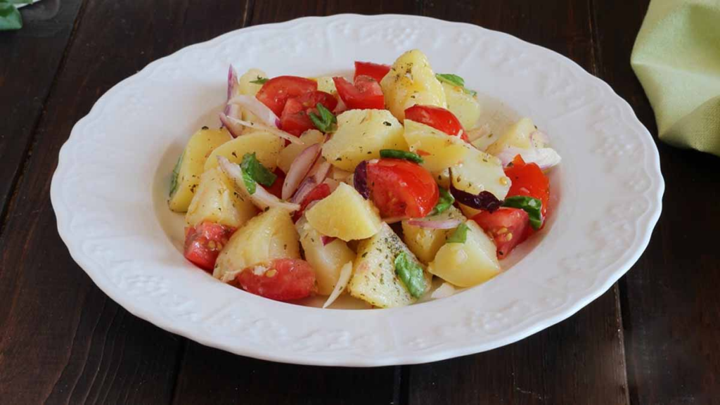 Aggiungete i pomodorini, la cipolla, il basilico tritato, il sale, l’olio, un pizzico di pepe e un po’ di origano.