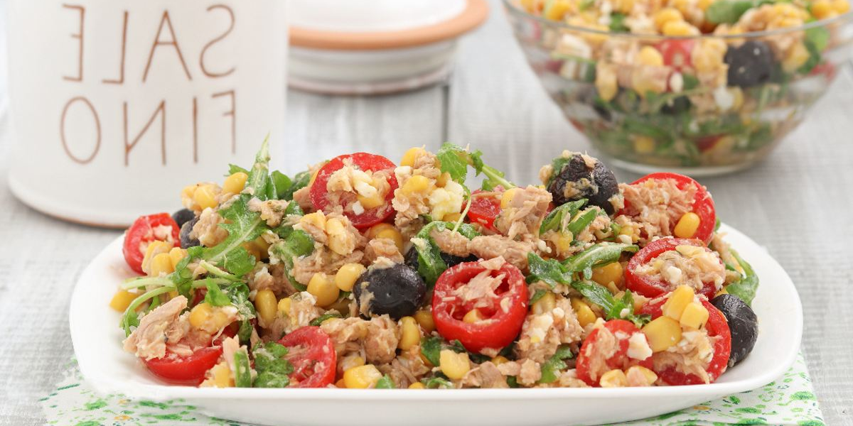 Aggiungete le uova sbriciolate, i pomodorini a fette, il mais ben sgocciolato, la rucola, il succo di un limone, l’olio d’oliva, l’origano, sale e pepe.