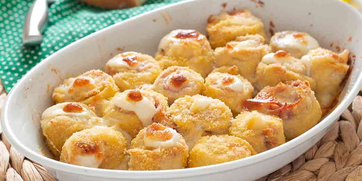 Come preparare gli involtini di pollo impanati ripieni di prosciutto e formaggio?