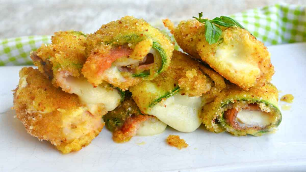 Sbattete l’uovo in una ciotola, arrotolate le zucchine, passatele nel pangrattato poi nell’uovo e ancora nel pangrattato.