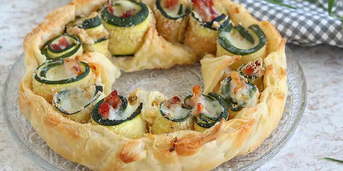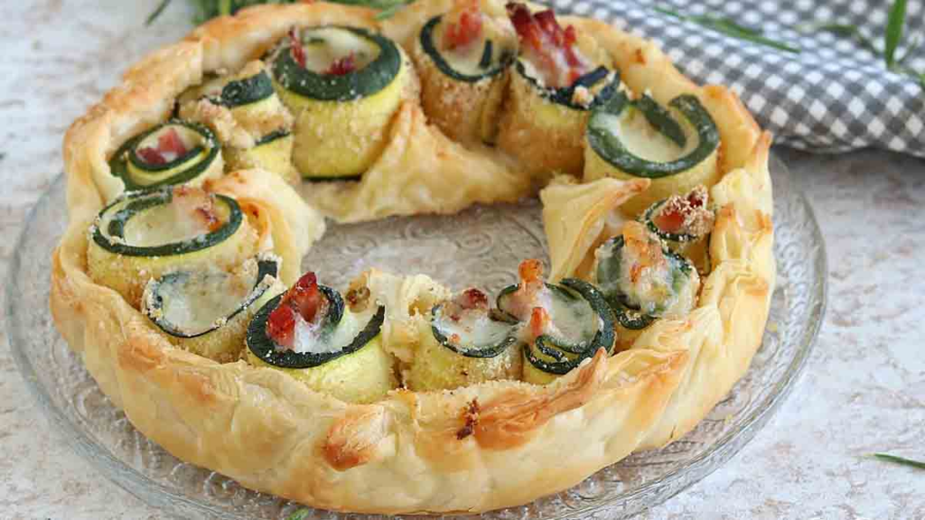 Passate gli involtini di zucchine nel pangrattato e disponeteli su un ripiano sul bordo della pasta sfoglia.