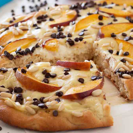 Focaccia dolce con crema pasticciera e pesche divinamente buone