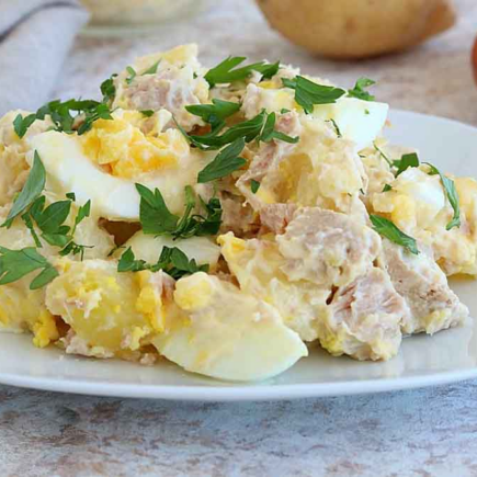 Insalata di patate molto gustosa con tonno e uova
