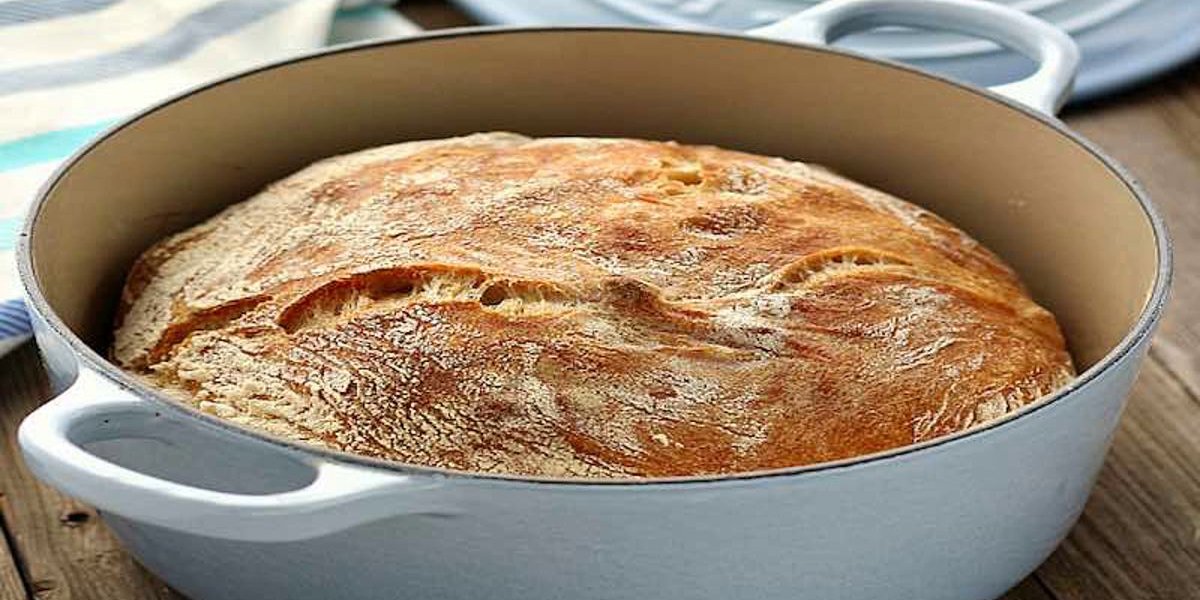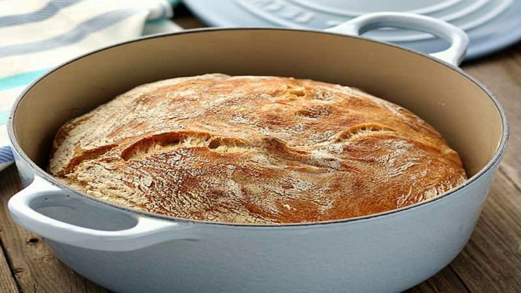 Preriscaldare il forno statico a 230 gradi. Posizionare una casseruola da 22 cm adatta alla cottura nel forno. Quando sarà caldo, toglietelo dal forno e adagiatevi il pane, girandolo in modo che le pieghe siano sopra. Metti il coperchio sulla pentola. Cuocere per mezz’ora, quindi scoprire e continuare la cottura per 15-20 minuti. Sfornare, lasciare raffreddare per due ore e affettare. Il Pane Magico in Casseruola Senza Impastare è pronto per essere servito.