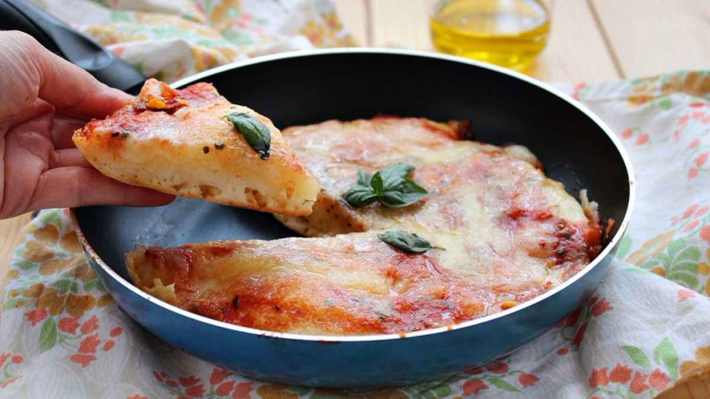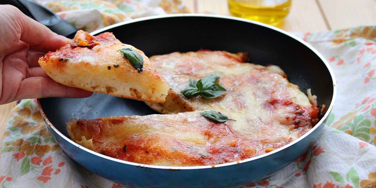 Versate nella padella la farina, il sale, l’acqua e il lievito e mescolate con un cucchiaio. Quando l’impasto sarà ben amalgamato, appiattitelo leggermente su tutta la superficie della teglia. Guarnire con passata di pomodoro, sale, origano e un filo d’olio. Coprite la padella con un coperchio e fate cuocere la pizza a fuoco basso per 10 minuti. Dopo 10 minuti aggiungete la mozzarella tagliata a cubetti, coprite e fate cuocere per altri 5 minuti.