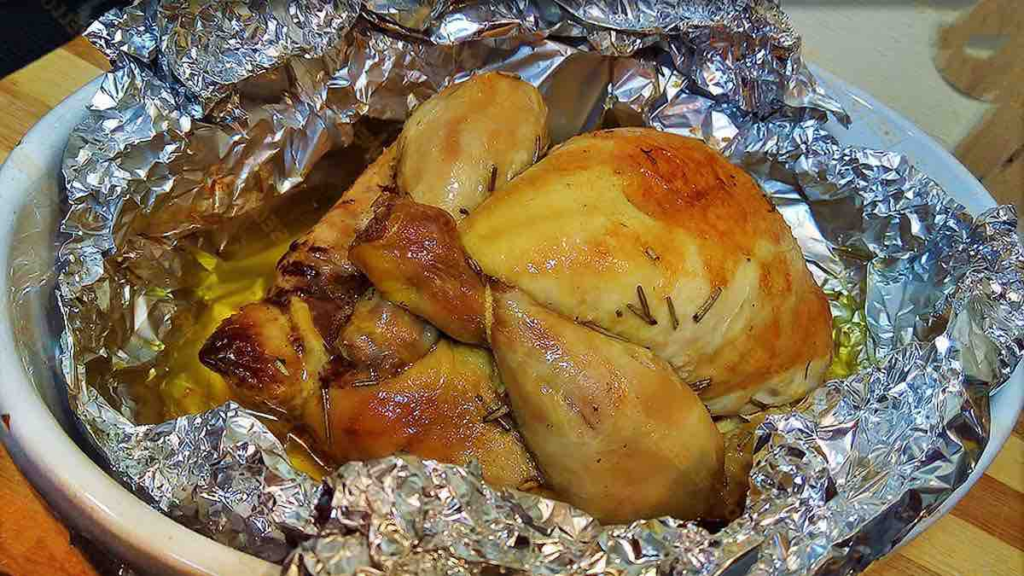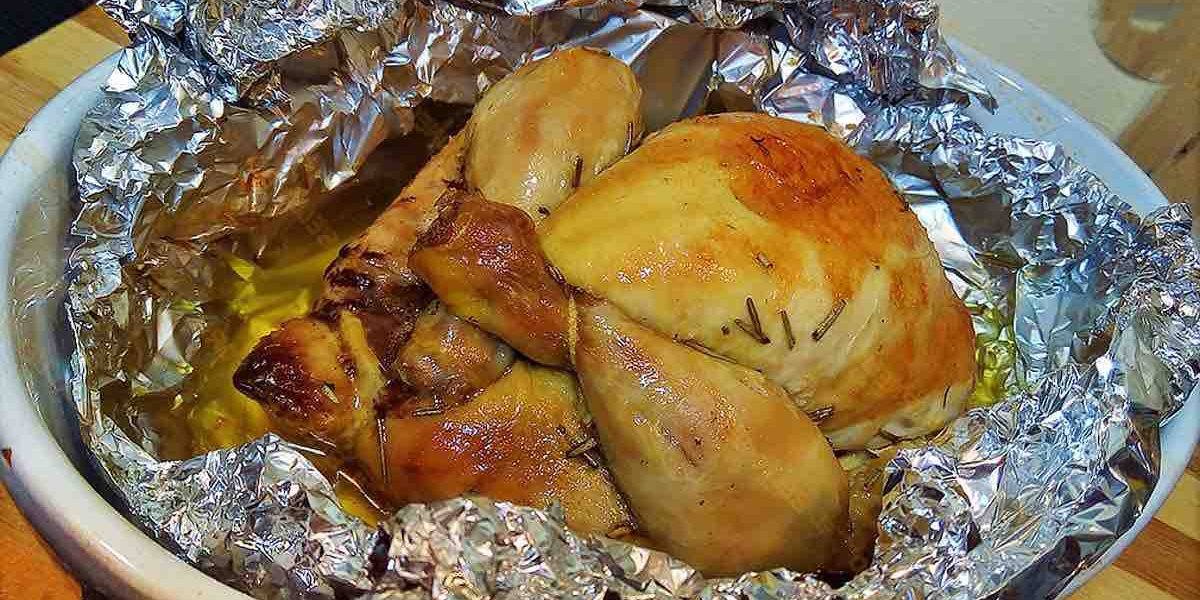 A questo punto legate le cosce con lo spago da cucina per garantire una cottura uniforme. Avvolgete il pollo nella carta stagnola, senza comprimerlo troppo. Mettere in una teglia. Cuocere per 30 minuti in forno preriscaldato a 220°. Trascorso questo tempo abbassate la temperatura a 180° e proseguite la cottura per altri 40 minuti.