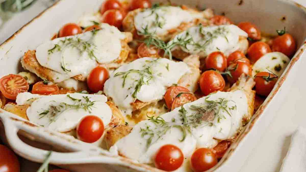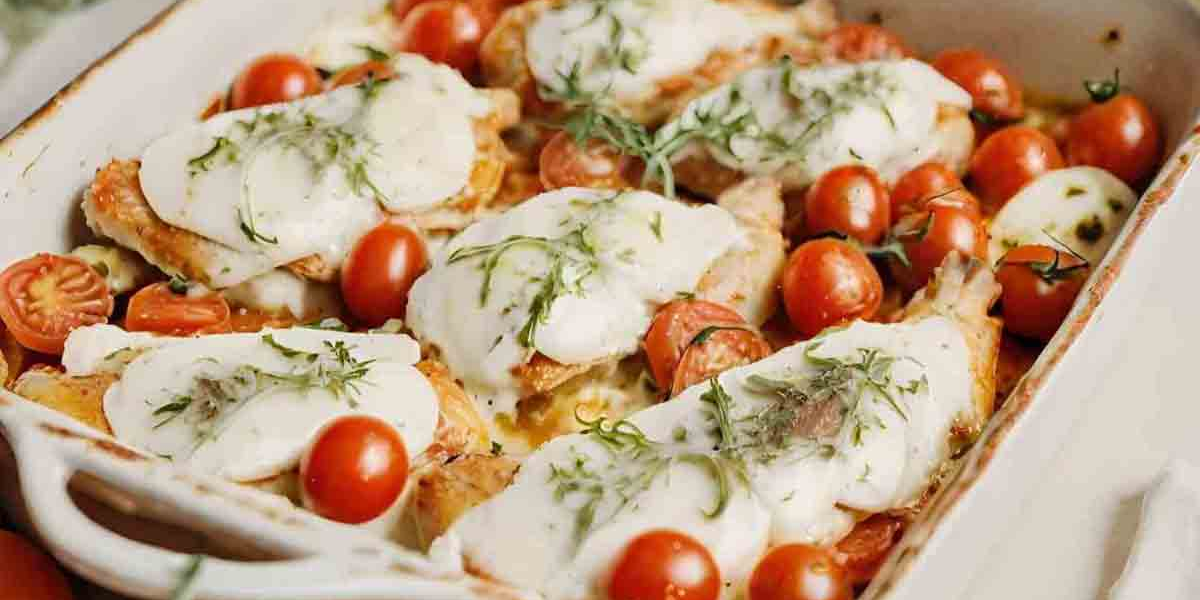 Trasferite le fettine di carne nel piatto, alternandole con la mozzarella a fette e i pomodorini.