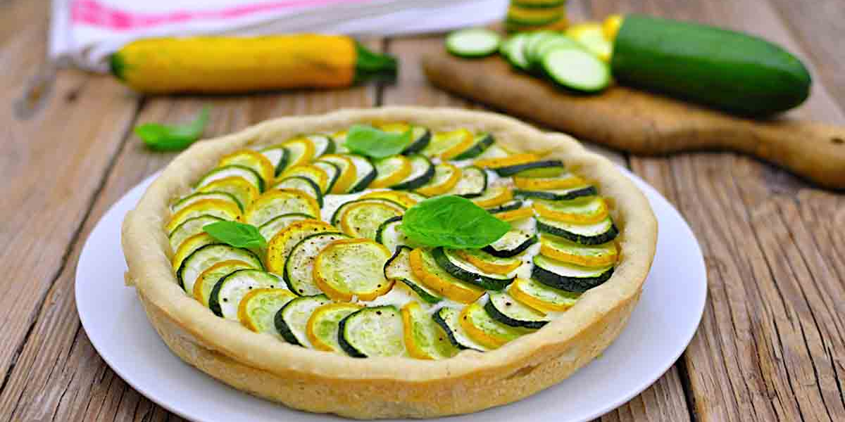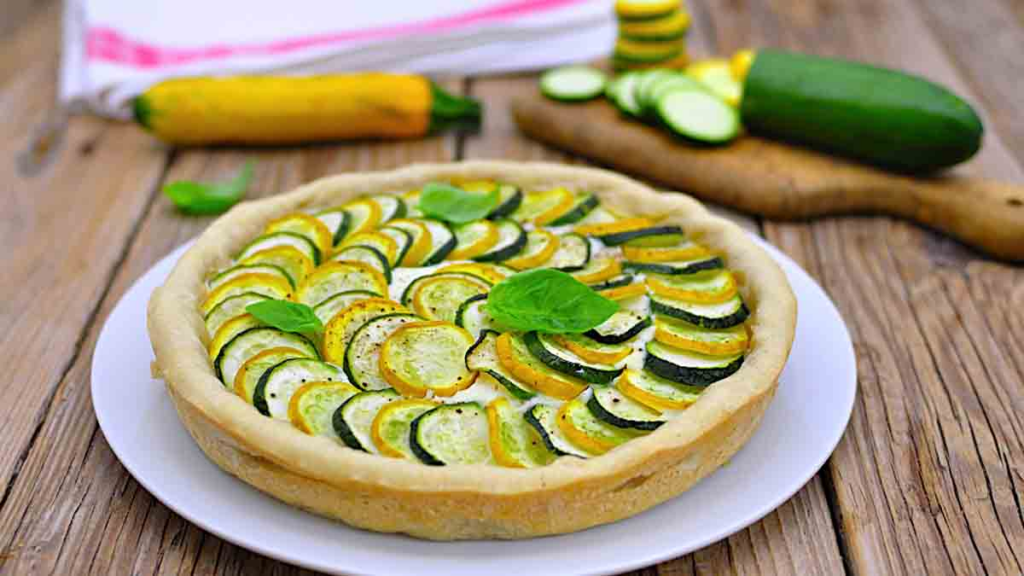 Sfornare, sformare la quiche di zucchine gialle e verdi e lasciarla raffreddare completamente su una griglia.