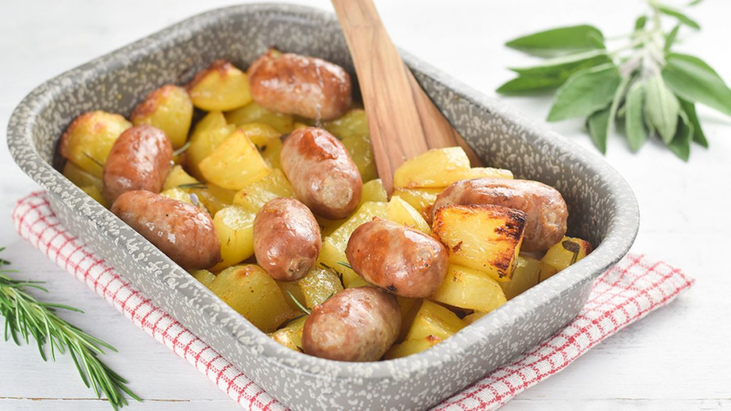 Rimettere in forno per altri 20-25 minuti, senza alluminio. A metà cottura girate le salsicce in modo che cuociano uniformemente senza seccarsi troppo. Servire caldo. Le salsicce piccanti e le patate al forno sono pronte per essere gustate.