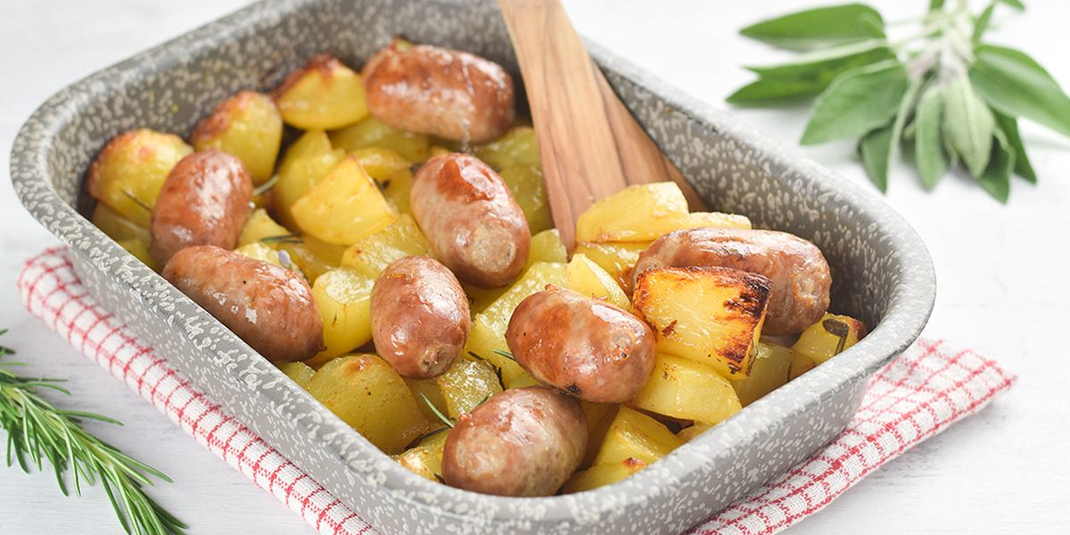 Sbucciare le patate, tagliarle a pezzi, lavarle e metterle in una ciotola. Condire con sale, origano, rosmarino, pepe nero, paprika e olio d’oliva. Mescolare con un cucchiaio. Trasferiteli su una piastra antiaderente, senza sovrapporli, per farli diventare più dorati. Cuocere per mezz’ora a 180°C in forno statico caldo, coprendo la placca con un foglio di alluminio. Sfornare, togliere la pellicola e aggiungere le salsicce sopra le patate o tra di esse.
