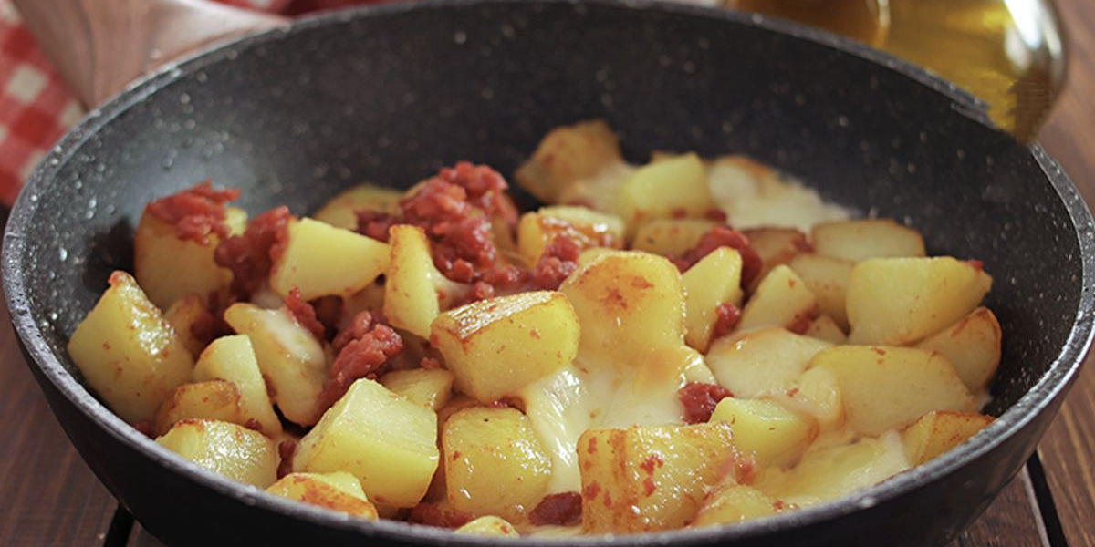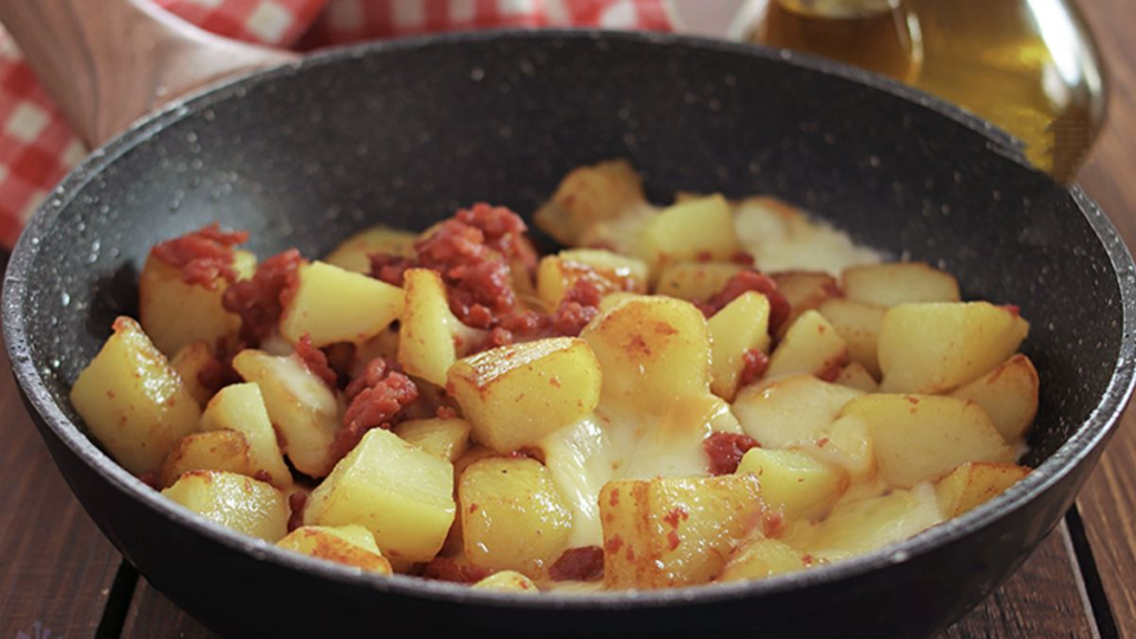 Metti una padella grande sul fuoco e lasciala scaldare. Togliete il budello alla salsiccia e sbriciolatela con le mani, quindi mettetela in padella a cuocere. Una volta cotta toglietela dalla padella ma lasciate in padella il grasso rilasciato dalla salsiccia. Cuocete i cubetti di patate sbollentati per circa 15 minuti a fuoco abbastanza vivace, girandoli continuamente finché non si sarà formata una crosticina dorata. Riporta la salsiccia nella padella. Tagliate il formaggio a quadretti e aggiungeteli alle patate e alla salsiccia. Coprite, abbassate la fiamma e fate cuocere a fuoco basso per altri 5 minuti finché il formaggio non si sarà sciolto. Le patate e la salsiccia con scamorza sono pronte.