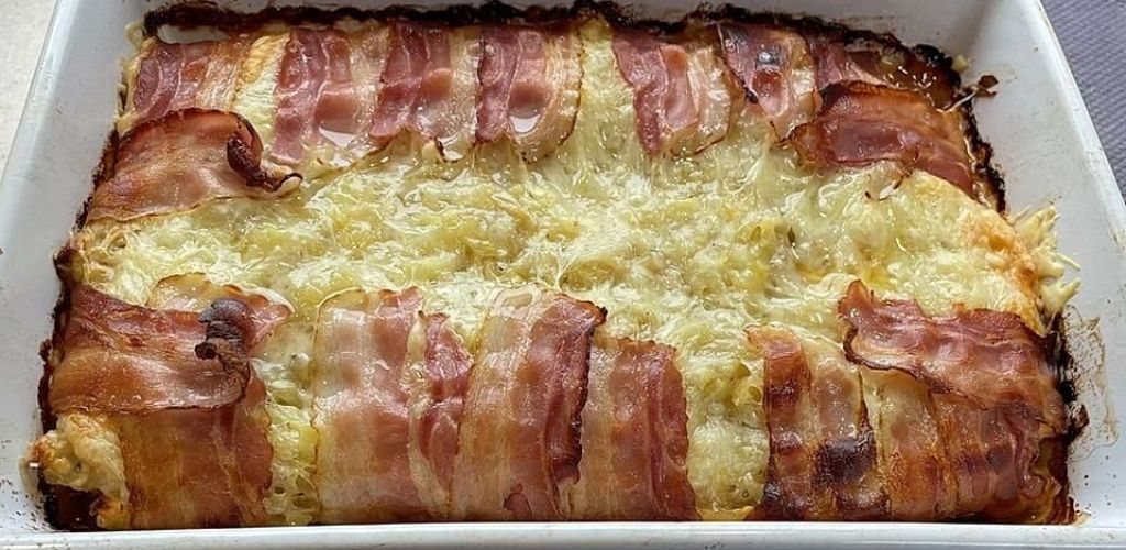 - Distribuire il resto delle patate. Ripiegare le fette di pancetta sporgenti sulla parte superiore.