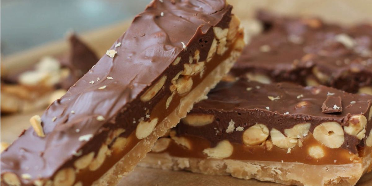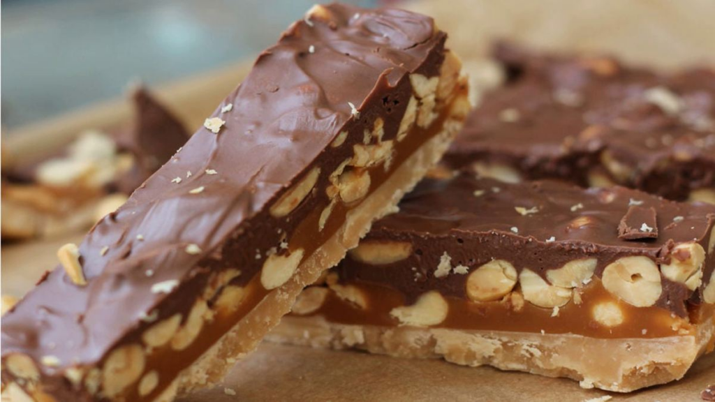 Preparare il torrone sciogliendo il burro. Mescolarlo con latte condensato e zucchero. Portare a ebollizione e continuare la cottura per 5 minuti. Fuori dal fuoco, aggiungere la crema spalmabile, la vaniglia e il burro di arachidi. Versare sopra il cioccolato al latte, quindi congelare il tutto per due ore.