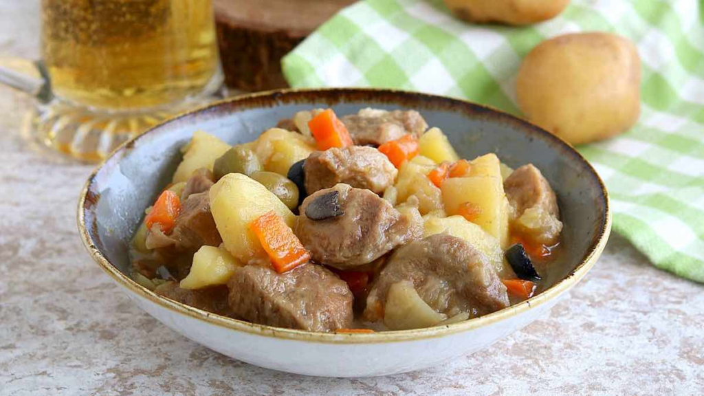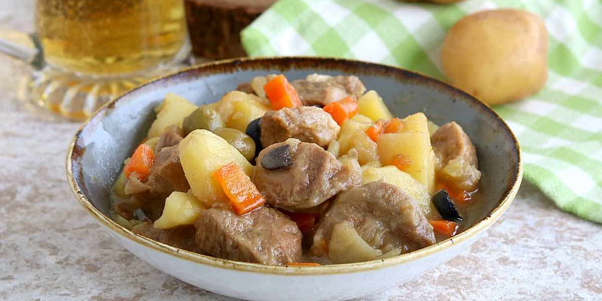 Cuocere per 30 minuti, quindi aggiungere le patate e le olive sbucciate e tagliate a pezzetti, mescolare. Cuocere per altri 20 minuti con il coperchio. Lo spezzatino di vitello con olive e patate è pronto per essere servito.