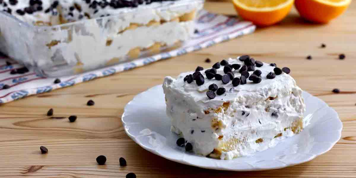 Servite il tiramisù all’arancia e gocce di cioccolato.