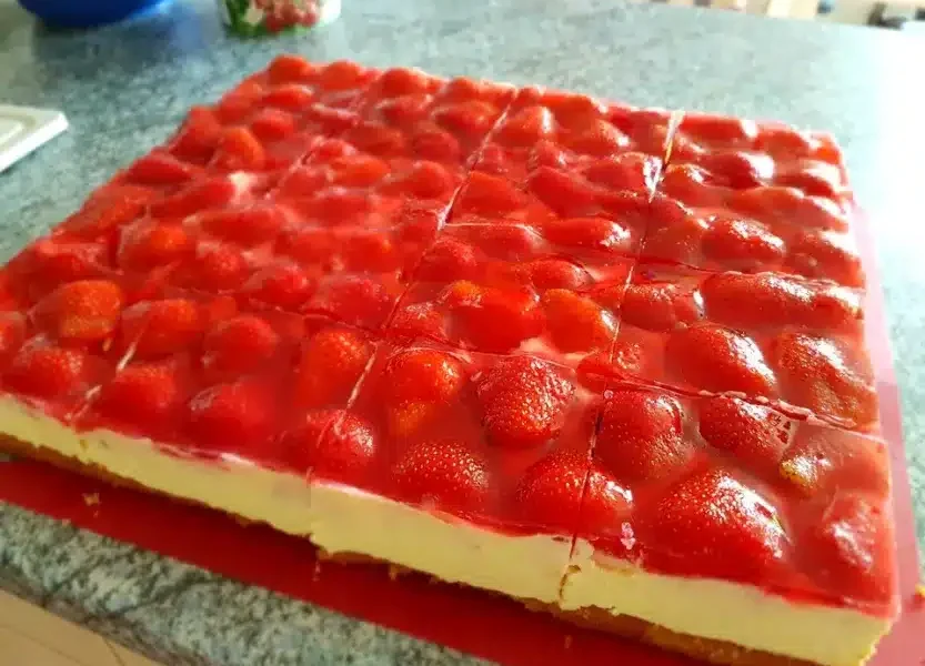 Distribuire le fragole lavate e private del gambo (quelle grandi vanno divise a metà) sulla crema alla vaniglia. Mescolare la glassa della torta con l’acqua secondo le istruzioni sulla confezione, cuocere e poi spalmare sulle fragole. Lasciate riposare e poi la torta è pronta per essere servita.