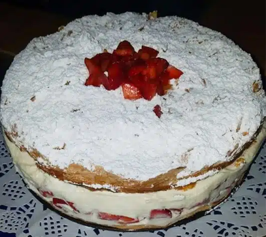 Mescolare la margarina con 100 g di zucchero fino a ottenere un composto spumoso (ca. 6 minuti), per lo stesso tempo incorporare il tuorlo d’uovo. Mescolare la farina e il lievito e incorporarli alternativamente al latte. Stendere metà dell’impasto in uno stampo a cerniera (26 cm di diametro), montare a neve ferma gli albumi con 100 g di zucchero, spalmare metà degli albumi sulla prima base della torta e spolverizzare con metà delle mandorle a scaglie. Cuocere in forno preriscaldato a circa 175 °C per circa 20 – 25 minuti. Fai lo stesso con il secondo piano. Lasciare raffreddare bene entrambe le basi.Per il ripieno, lavare, pulire e tagliare a pezzetti 500 g di fragole. Sbattere la panna con lo zucchero vanigliato e 1 bustina di panna a neve ferma. Mescolare il mascarpone con 70 g di zucchero, il succo di limone e 1 bustina di addensante per panna. Incorporate la panna montata e distribuite un quarto del ripieno sul primo strato. Distribuire le fragole sopra. Spalmare sopra la crema rimasta e ricoprire con il secondo strato. Ricordatevi di preparare la torta 1 – 2 giorni prima del consumo in modo che possa solidificare bene! La torta può essere preparata anche con i lamponi come torta ai lamponi.