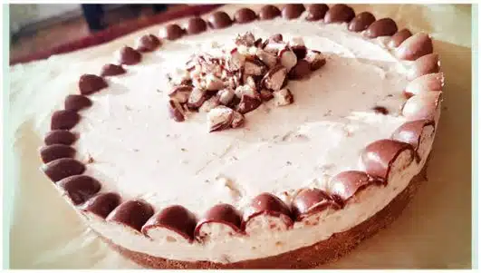 Tagliare i cioccolatini a metà e guarnire la torta.