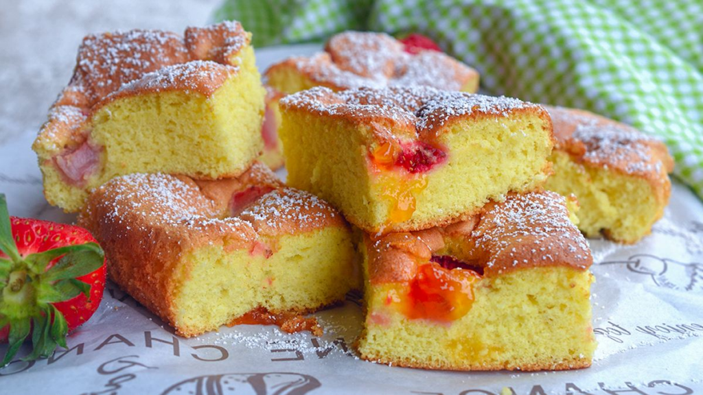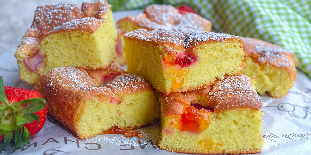 Lavorare con le fruste elettriche le uova e lo zucchero fino al raddoppio del volume. Aggiungete poco alla volta la farina setacciata con il lievito. Versate poi il composto in uno stampo quadrato da 20 cm o 22 cm. Aggiungere la marmellata con un cucchiaino. Tagliate le fragole a pezzetti e disponetele sull’impasto.