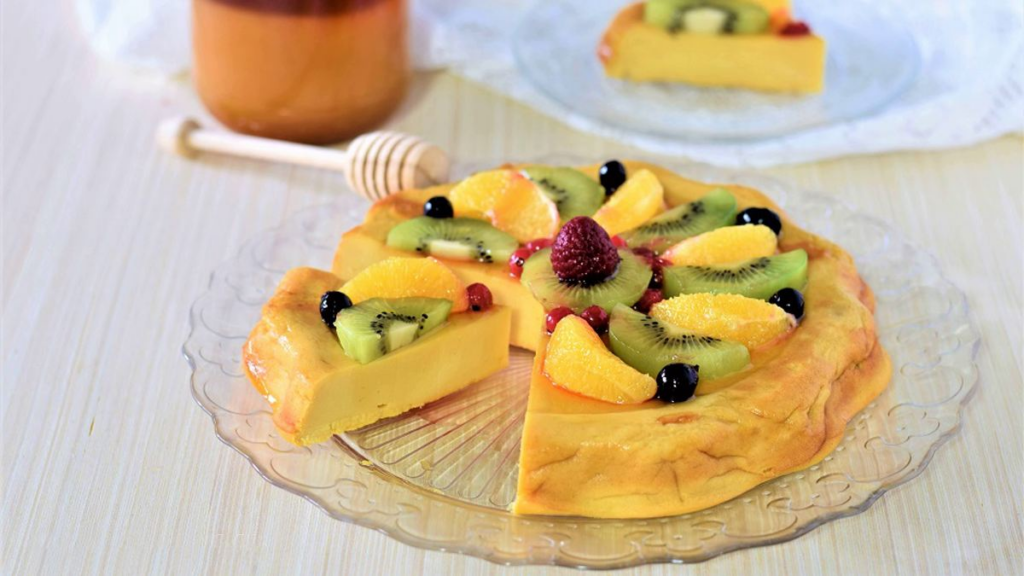 Pulite la frutta e disponetela sulla torta a piacere, poi versateci sopra il miele. La torta benessere con frutta fresca è pronta da servire.