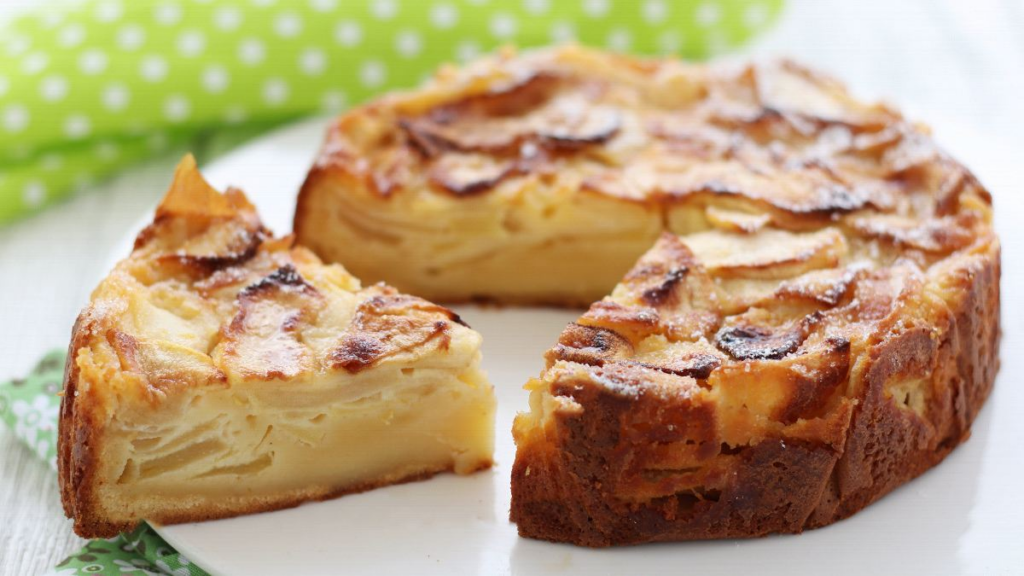 Foderare uno stampo da 18 cm di diametro con carta da forno e versarvi il composto. Sbucciare le mele, tagliarle a fettine sottili e aggiungerle al composto. Pressate con un cucchiaio per immergerle meglio, avendo cura di creare uno strato di fettine di mela sulla superficie.