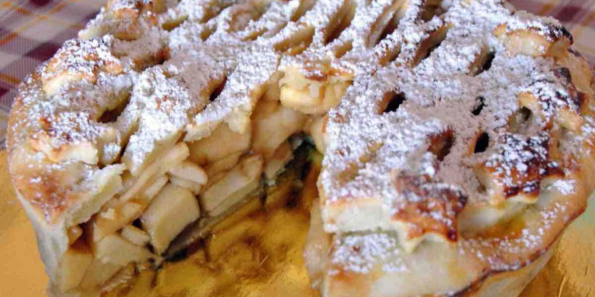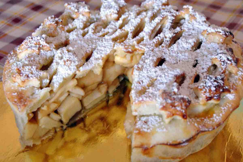 Stendere la pasta sottilmente e foderare con essa uno stampo di 18 cm di diametro. Riempire con il composto di mele. Con il resto dell’impasto fate un coperchio, tagliatelo in più punti e posizionatelo sulla torta, facendo attenzione che i bordi aderiscano bene. Cuocere in forno ventilato preriscaldato a 160° per 45 minuti. La torta di mele piacevolmente profumata è pronta.