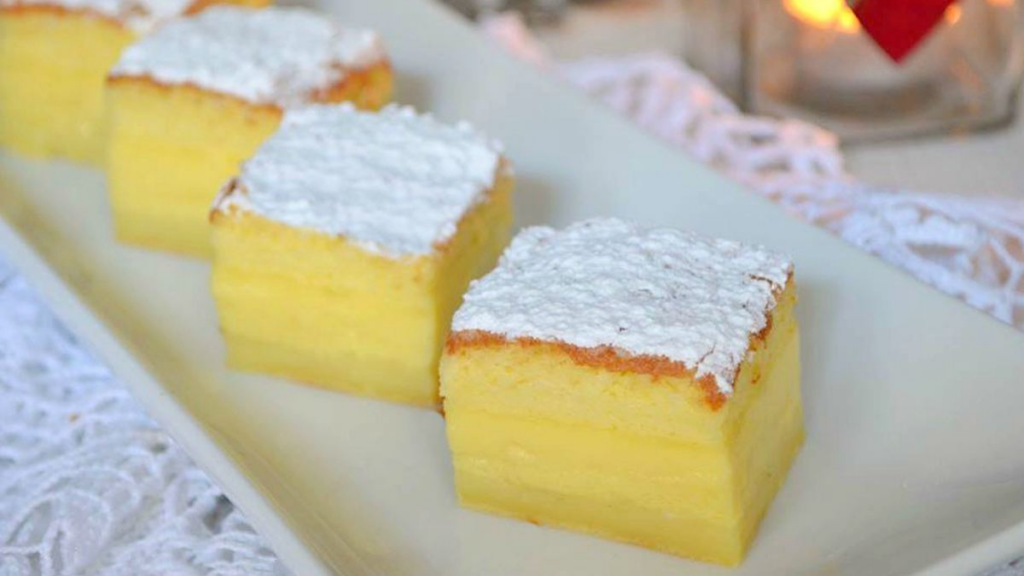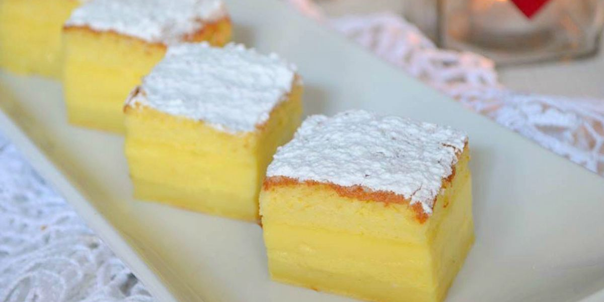 Cuocere in forno caldo a 150° in modalità statica per 80 minuti. Una volta cotta, togliete la torta magica al limone dal forno e lasciatela raffreddare completamente. Coprire con pellicola e lasciare riposare in frigorifero per almeno 2 ore. Trascorso questo tempo tagliatelo a quadretti utilizzando un coltello umido. Spolverate con zucchero a velo e servite.