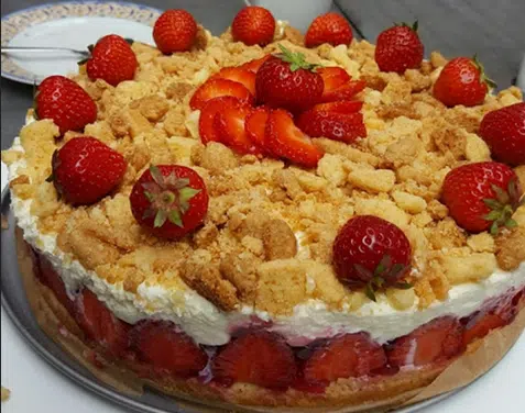 Montare a neve la panna, i solidi della panna, lo zucchero vanigliato e lo zucchero, versarvi sopra la copertura alle fragole, cospargere sulla panna lo streusel preparato sulla teglia, premere leggermente e guarnire con le fragole.