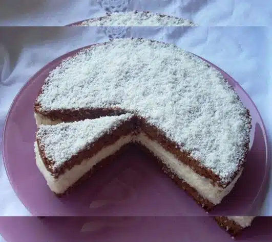 Dividete la torta a metà nel senso della lunghezza e spalmatela con la crema al cocco. Premere leggermente e lasciare raffreddare, idealmente per tutta la notte. Spalmare la superficie con la marmellata e cospargere con scaglie di cocco. Buon appetito!