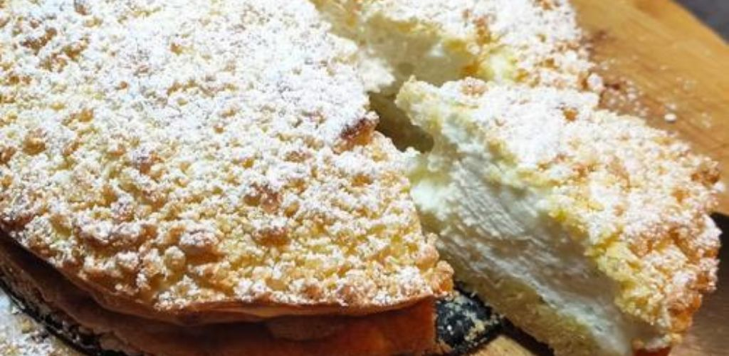 Prendiamo la pasta frolla e mettiamo in una teglia a cerniera del diametro di 20 cm, precedentemente imburrata e infarinata, un po’ più della metà dell’impasto sbriciolato sul fondo. Aggiungiamo la crema allo yogurt e ricopriamo con la restante pasta frolla sbriciolata.