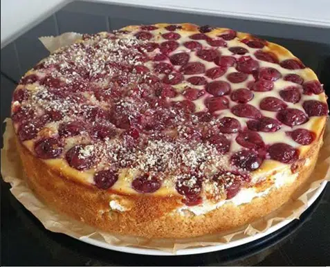 Distribuire sull’impasto di briciole prima il composto (liquido) di quark e panna acida e poi le ciliegie. Cospargere con mandorle a scaglie.