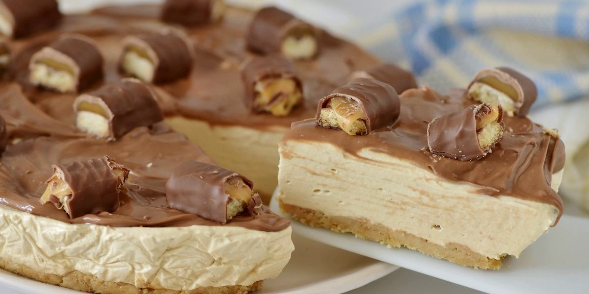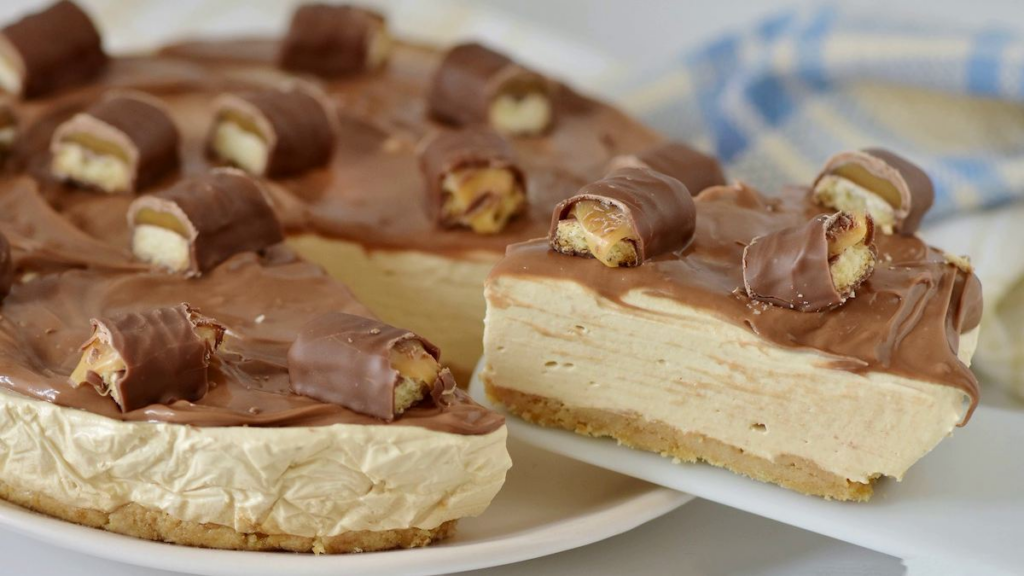 Tagliate a fette lo yogurt senza cottura e la torta Twix e servite.